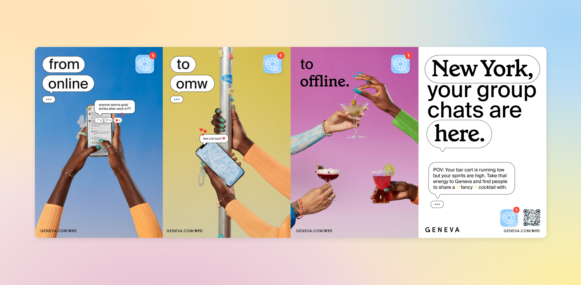Our next campaign was about emphasizing Geneva’s support of location-based IRL groups on the app. After noticing an increased number location-specific groups being created, we pivoted as a company and embraced a new short-hand for our IRL efforts: online to offline.